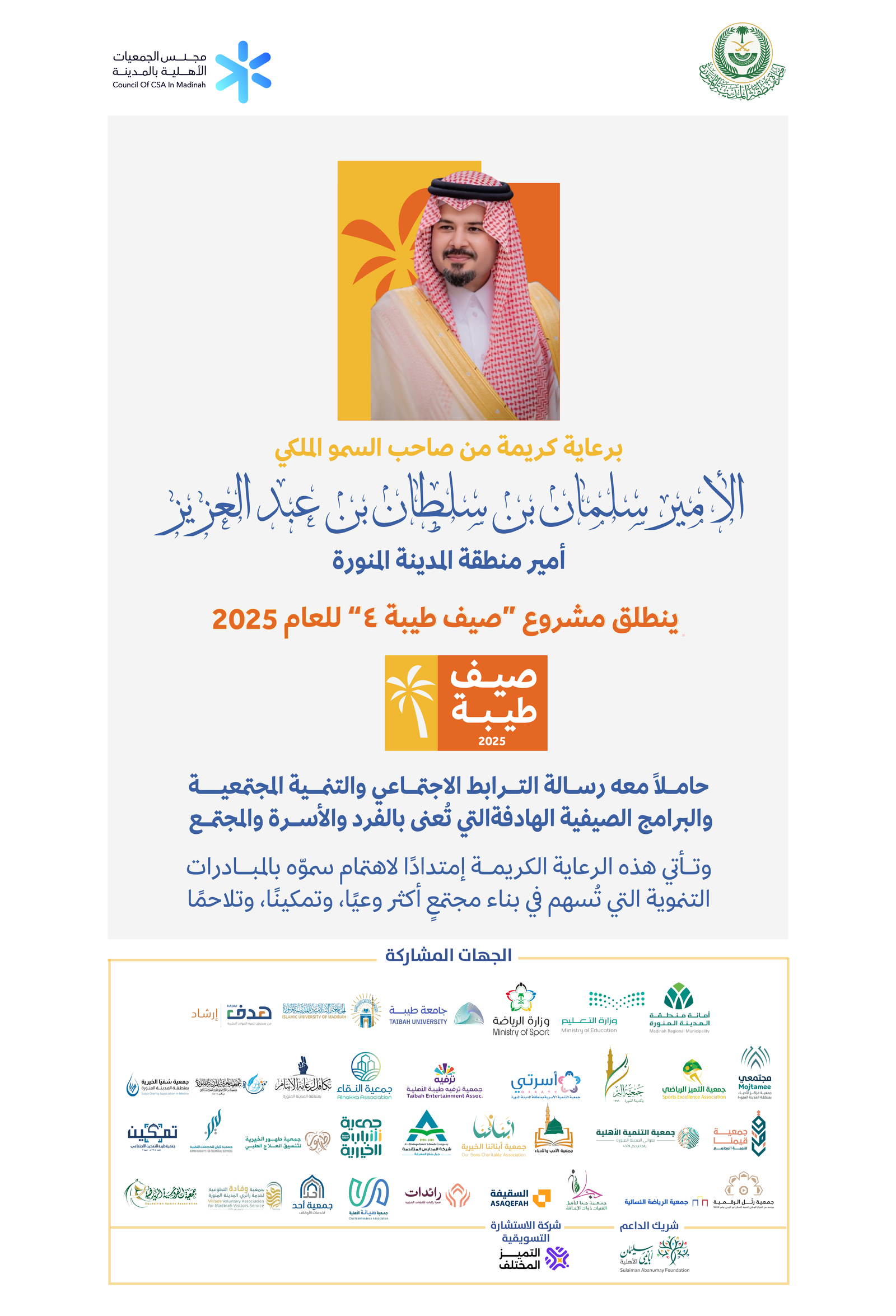 برعاية صاحب السمو الملكي الأمير سلمان بن سلطان بن عبدالعزيز، أمير منطقة المدينة المنورة، انطلقت فعاليات صيف طيبة 2025 بمشاركة عدد من الجهات الحكومية والأهلية، حيث تُنَظم البرامج والأنشطة الترفيهية والقيمية والثقافية بمختلف أحياء المدينة.