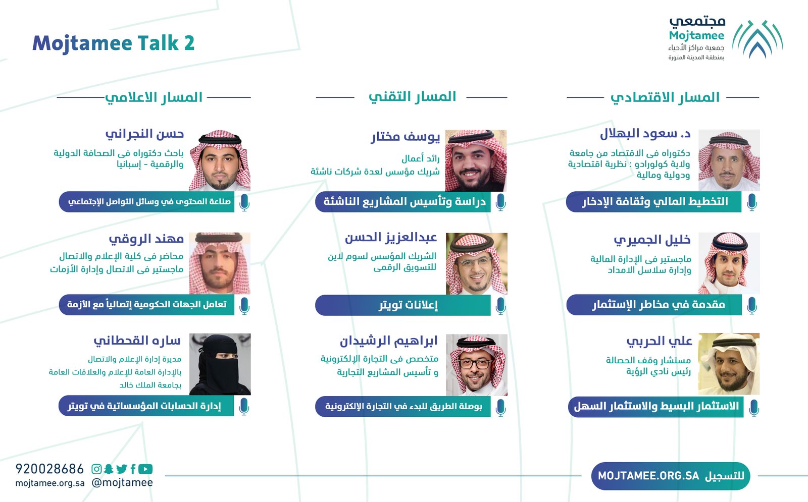 وتستضيف مجتمعي في الانطلاقة الثانية نخبة من المدربين المتخصصين في المجال الاقتصادي، التقني، والإعلامي، للحديث عن أساسيات في الادخار والاستثمار، وتوظيف التقنية في المشاريع التجارية، وصناعة المحتوى في وسائل التواصل الاجتماعي وإدارتها.
